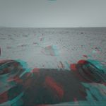 This 3-D stereo anaglyph image was taken by the Mars Exploration Rover Spirit front hazard-identification camera after the rover's first post-egress drive on Mars Sunday. Engineers drove the rover approximately 3 meters (10 feet) from the Columbia Memorial Station toward the first rock target, seen in the foreground. The football-sized rock was dubbed Adirondack because of its mountain-shaped appearance. Scientists plan to use instruments at the end of the rover's robotic arm to examine the rock and understand how it formed.