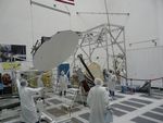 Aquarius 2.5 meter reflector is hoisted before being attached to boom in the clean room at NASA's Jet Propulsion Laboratory in Pasadena, Calif.