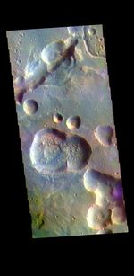 The THEMIS VIS camera contains 5 filters. The data from different filters can be combined in multiple ways to create a false color image. These false color images may reveal subtle variations of the surface not easily identified in a single band image. Today's false color image shows part of northern Arabia Terra. Arabia Terra is one of the oldest surface regions on Mars and contains a large variety of surface features. The region is dissected with numerous unnamed channels of all sizes and complexities, as well as numerous pits of unknown origin. The channel in this image is one of many small channels that coalesce into larger channels that eventually empty into the lower elevation northern plains of Acidalia Planitia.