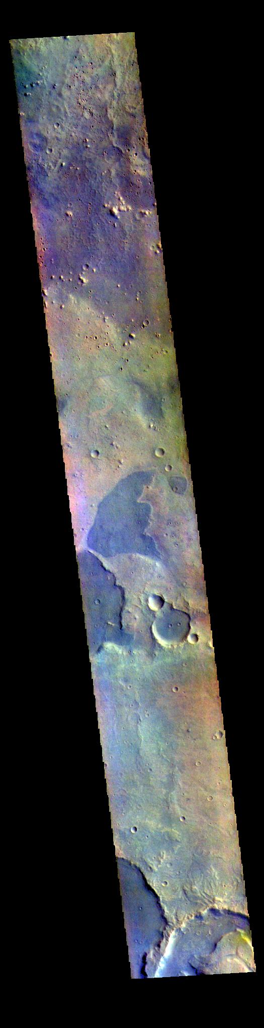 The THEMIS VIS camera contains 5 filters. The data from different filters can be combined in multiple ways to create a false color image. These false color images may reveal subtle variations of the surface not easily identified in a single band image. Today's false color image shows part of northern Arabia Terra. Arabia Terra is one of the oldest surface regions on Mars and contains a large variety of surface features. The region is dissected with numerous unnamed channels of all sizes and complexities, as well as numerous pits of unknown origin.