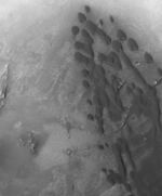 This Mars Global Surveyor (MGS) Mars Orbiter Camera (MOC) image shows a field of low-albedo (dark) barchan sand dunes in a crater located in western Arabia Terra. Small dunes like these are common in the craters of western Arabia Terra and they are often the source of finer, dark sediment that forms windstreaks further downwind. The steepest slopes on the dunes, their slipfaces, are pointed toward the southeast (lower right), indicating that the dominant winds in this location come from the opposite direction.