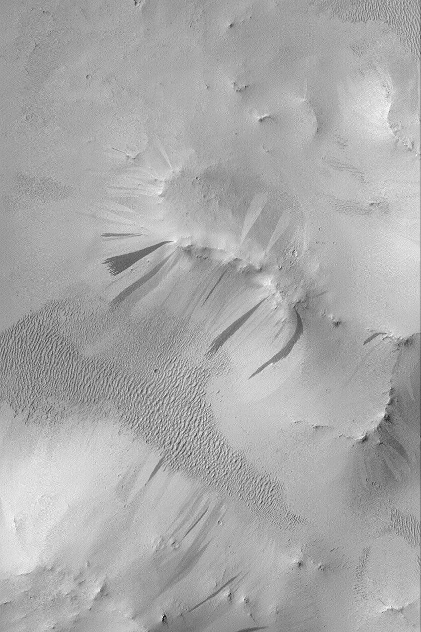 Arabia Terra is a vast, heavily cratered region in the martian northern hemisphere. Much of Arabia Terra is thickly blanketed by dust. From time to time, on steep slopes, the dust will avalanche or slide downhill, creating a streak. The majority of slope streaks are darker than their surroundings, but not all of them are dark. In Arabia, it is common to find bright and dark slope streaks, and to find them together. This Mars Global Surveyor (MGS) Mars Orbiter Camera (MOC) image shows an example, taken from a crater near 10.5°N, 318.4°W. Why some streaks are bright and others are dark is not yet known. This picture covers an area 3 km (1.9 mi) wide and is illuminated by sunlight from the left.