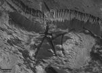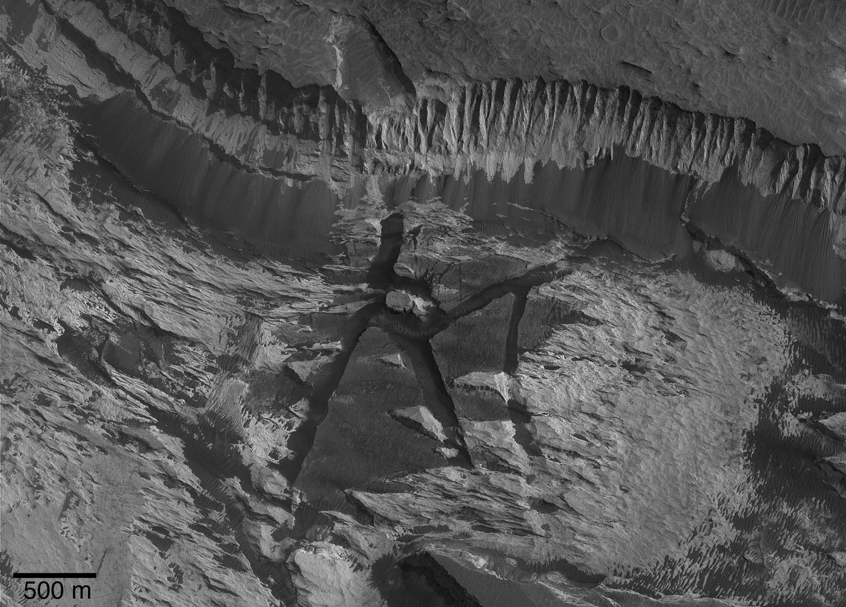 This picture is a mosaic of two Mars Global Surveyor (MGS) Mars Orbiter Camera (MOC) images of sedimentary rock outcrops in Aram Chaos, near Ares Vallis, Mars. Aram Chaos is an impact crater that was nearly completely filled with material, some of which is light-toned, layered, sedimentary rock. The MGS Thermal Emission Spectrometer team detected crystalline hematite in Aram Chaos, attesting to its potential similarity to some of the rocks in Meridiani Planum, where the Mars Exploration Rover (MER-B), Opportunity, has been operating. During April 2005, an opportunity arose to acquire a MOC narrow angle camera image that would mosaic with a previous picture, R11-02268. The figure shown here is a mosaic of that earlier image, obtained in November 2003, and the newer picture, from April 2005. Sunlight illuminates the scene from the right, and north is toward the bottom. A steep slope is seen near the top of the image. It formed in light-toned sedimentary rock, and it has shed debris to form a suite of darker-toned talus deposits. These deposits are the products of dry mass movement; the darker tone of the debris might be an indication that the material is less weathered or coarse-grained. Evident below the scarp are several light-toned yardangs, sculpted by wind. Erosion of the yardang-forming material, interpreted to be sedimentary rock, has revealed dark-toned blocks, separated by troughs. The blocks pre-date the deposition of the yardang-forming material. The presence of these broken-up blocks suggests that a chaotic terrain pattern formed in Aram Chaos long ago, before subsequent deposition of material that later became the light-toned, sedimentary rock. The geologic history recorded in Aram Chaos is no less complex than has been observed by MOC in other large craters, such as Gale.