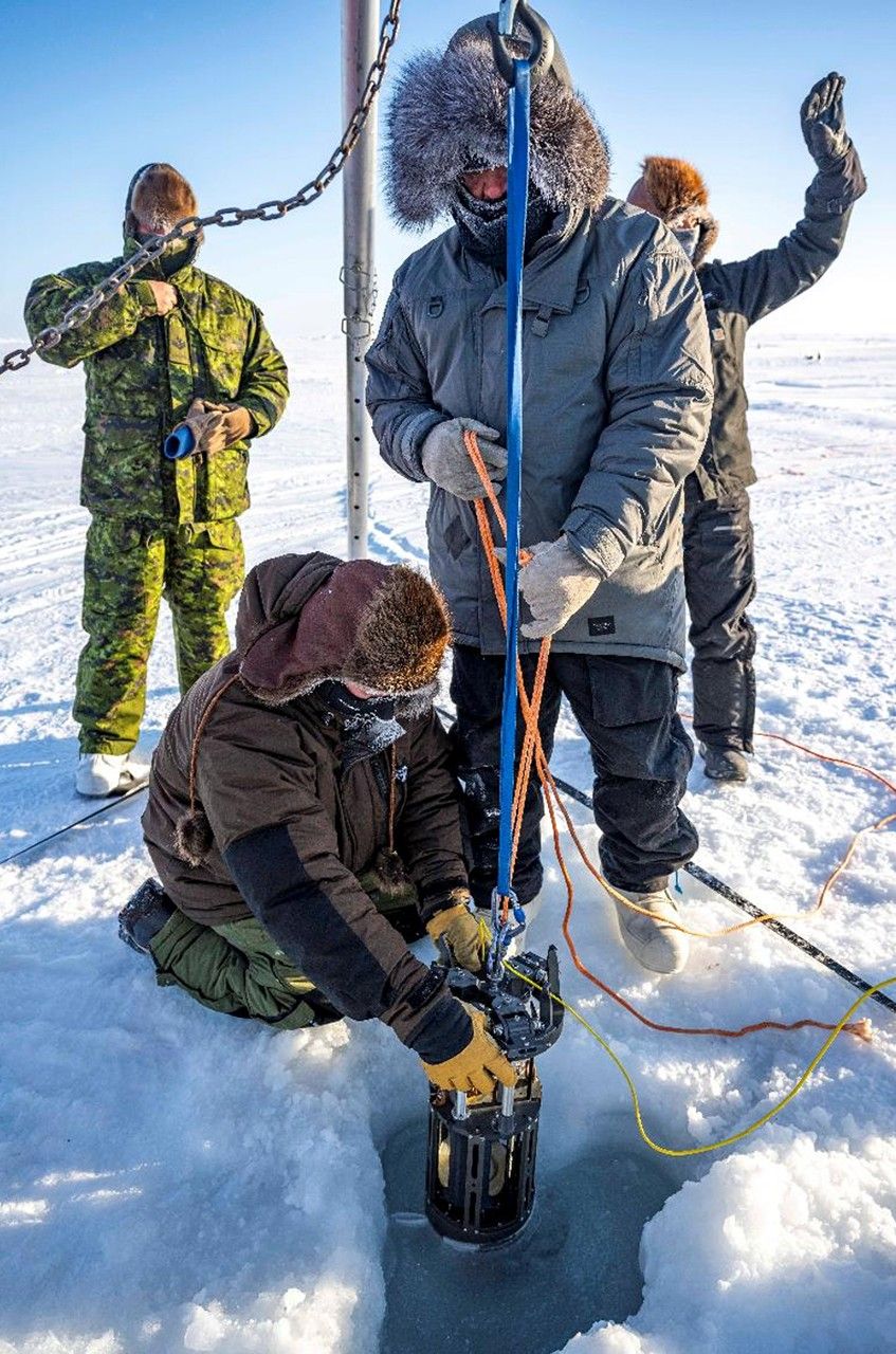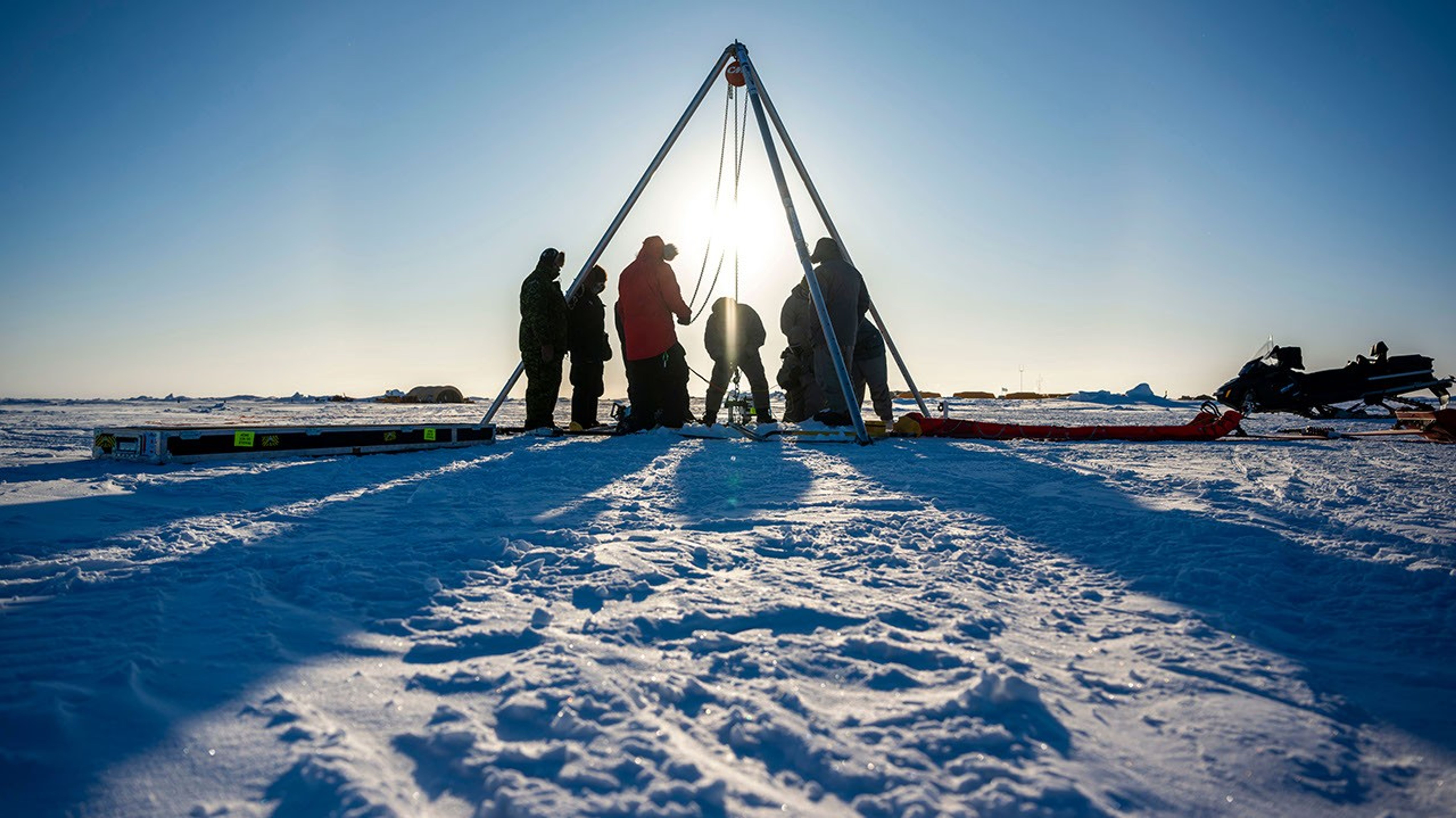 This image, as well as Figures A and B, shows the team lowering the prototype through a borehole in the sea ice. During this Arctic field test, the robot descended on a tether about 330 feet (100 meters) into the ocean, where its instruments gathered salinity, temperature, and flow data. The team also conducted tests to determine adjustments that would enable them to take the robot off-tether.