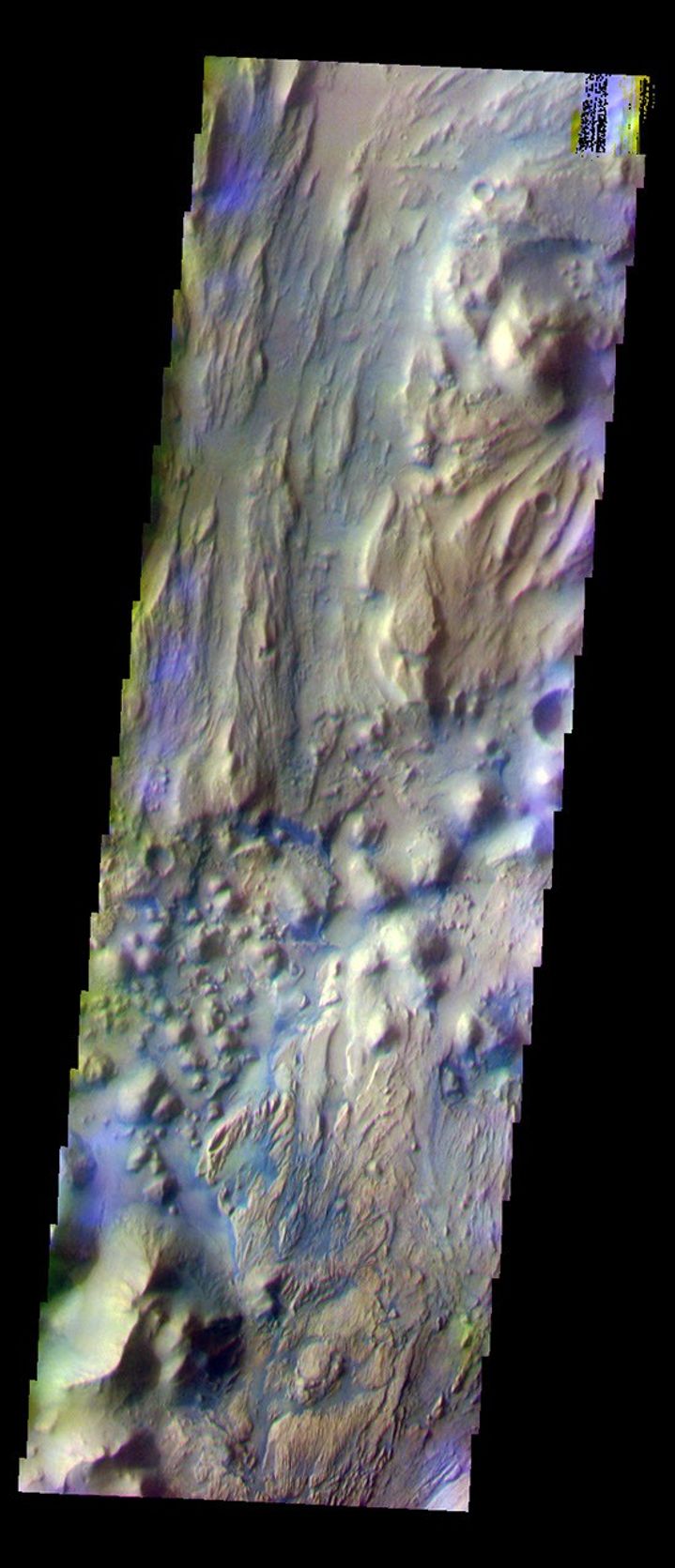 This false color image is located in the region where Ares Vallis enters Iani Chaos. Compare the different surface textures in today's image with the previous three images (PIA07919, PIA07918, PIA07917). This image was collected during the Southern Fall season.