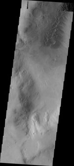Note: this THEMIS visual image has not been radiometrically nor geometrically calibrated for this preliminary release. An empirical correction has been performed to remove instrumental effects. A linear shift has been applied in the cross-track and down-track direction to approximate spacecraft and planetary motion. Fully calibrated and geometrically projected images will be released through the Planetary Data System in accordance with Project policies at a later time.