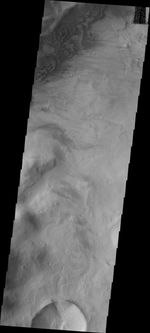Note: this THEMIS visual image has not been radiometrically nor geometrically calibrated for this preliminary release. An empirical correction has been performed to remove instrumental effects. A linear shift has been applied in the cross-track and down-track direction to approximate spacecraft and planetary motion. Fully calibrated and geometrically projected images will be released through the Planetary Data System in accordance with Project policies at a later time.
