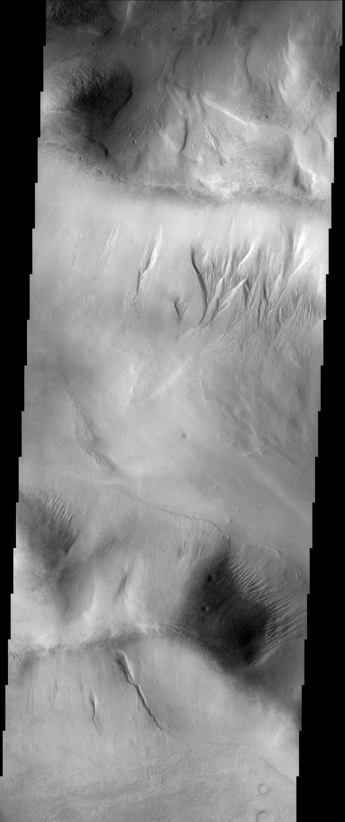 Note: this THEMIS visual image has not been radiometrically nor geometrically calibrated for this preliminary release. An empirical correction has been performed to remove instrumental effects. A linear shift has been applied in the cross-track and down-track direction to approximate spacecraft and planetary motion. Fully calibrated and geometrically projected images will be released through the Planetary Data System in accordance with Project policies at a later time.