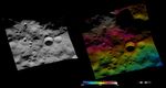 The left-hand image is a Dawn FC (framing camera) image, which shows the apparent brightness of Vesta's surface. The right-hand image is based on this apparent brightness image, which has had a color-coded height representation of the topography overlain onto it. The topography is calculated from a set of images that were observed from different viewing directions, which allows stereo reconstruction. The various colors correspond to the height of the area. The white and red areas in the topography image are the highest areas and the blue areas are the lowest areas. Arruntia crater is the large crater offset from the center of the image. In the topography image it is clear that the area Arruntia formed on is sloping from the top of the image to the bottom. Also, the colored topography contours inside of the crater to the right of Arruntia show that it is very shallow. This is because they follow the pattern of the contours outside of the crater. If the crater was deeper or more pronounced the contours would have a different pattern inside of the crater.