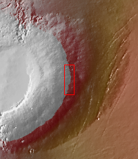 This VIS image shows the eastern flank of Arsia Mons midway between the summit of the volcano and the surrounding plains. Note the small linear fractures which trend towards the top of the image; these fractures encircle the volcano.