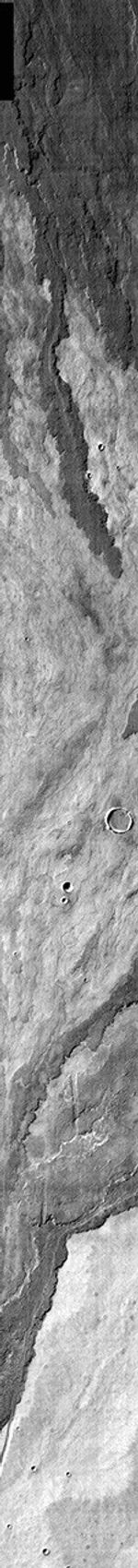 Note: this THEMIS visual image has not been radiometrically nor geometrically calibrated for this preliminary release. An empirical correction has been performed to remove instrumental effects. A linear shift has been applied in the cross-track and down-track direction to approximate spacecraft and planetary motion. Fully calibrated and geometrically projected images will be released through the Planetary Data System in accordance with Project policies at a later time.