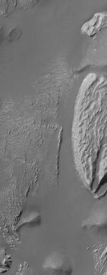 This Mars Global Surveyor (MGS) Mars Orbiter Camera (MOC) image shows light-toned rock outcrops, possibly sedimentary rocks, in the Arsinoes Chaos region east of the Valles Marineris trough system. These rocky materials were once below the martian surface. These features are located near 7.2°S, 27.9°W. The image covers an area about 3 km (1.9 mi) wide. Sunlight illuminates the scene from the upper left.