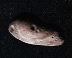 Artist's concept of Kuiper Belt object 2014 MU69, which is the next flyby target for NASA's New Horizons mission. Scientists speculate that the Kuiper Belt object could be a single body (above) with a large chunk taken out of it, or two bodies that are close together or even touching (see PIA21867).
