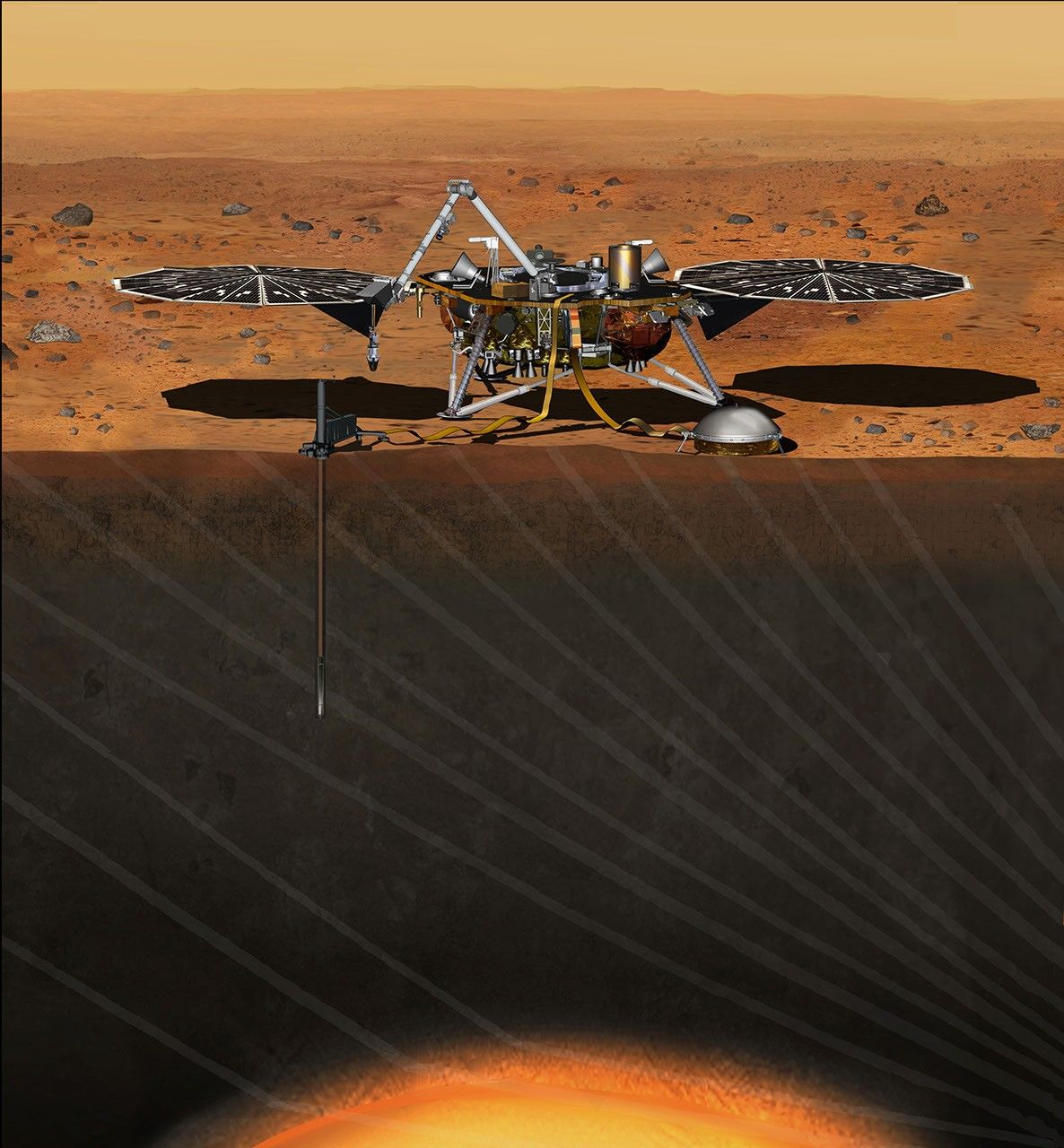 InSight will deploy two instruments to the ground using a robotic arm: a seismometer (contributed by the French space agency Centre National d'Etudes Spatiales, or CNES) to measure the microscopic ground motions from distant marsquakes, providing detailed information about the interior structure of Mars; and a heat-flow probe (contributed by the German Aerospace Center, or DLR) designed to hammer itself 3 to 5 meters (about 16 feet) deep and monitor heat coming from the planet's interior. The mission will also track the lander's radio to measure wobbles in the planet's rotation that relate to the size of its core and will include a camera and a suite of environmental sensors to monitor the weather and variations in the magnetic field. Lockheed Martin Space Systems, Denver, is building the spacecraft.