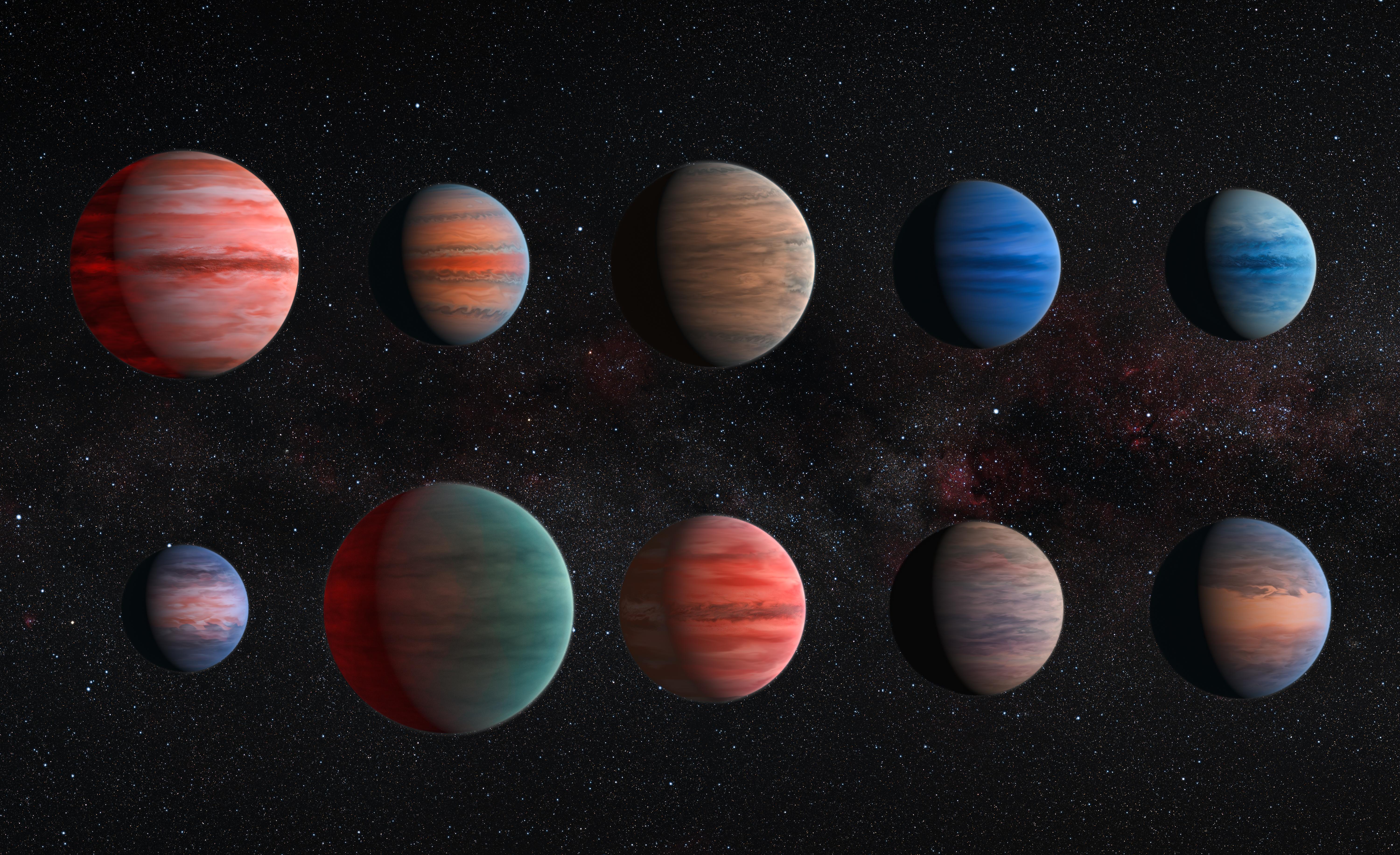 The colors of the planets are for illustration purposes only. There is little scientific data on color with the exception of HD 189733b, which became known as the "blue planet." The planets are also depicted with a variety of different cloud properties. The wind patterns shown on these 10 planets, which resemble the visible structures on Jupiter, are based on theoretical models.