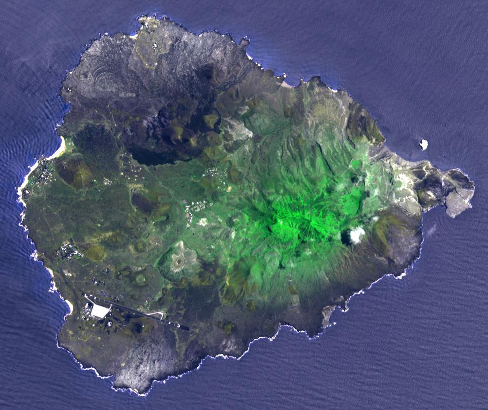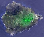 Two hundred years ago, Ascension Island was a barren volcanic edifice. Today its peaks are covered by lush tropical cloud forest. The small island is located in the mid-Atlantic, between South America and Africa. Charles Darwin visited the barren island and hatched a plot with Joseph Hooker, botanist and explorer. Beginning in 1850, ships stopping deposited an assortment of plants from botanical gardens in Europe, Argentina, and South Africa. Soon the island was "terra-formed". The image was acquired March 11, 2010, covers an area of 13 by 15 km, and is located at 8 degrees south, 14.4 degrees west.