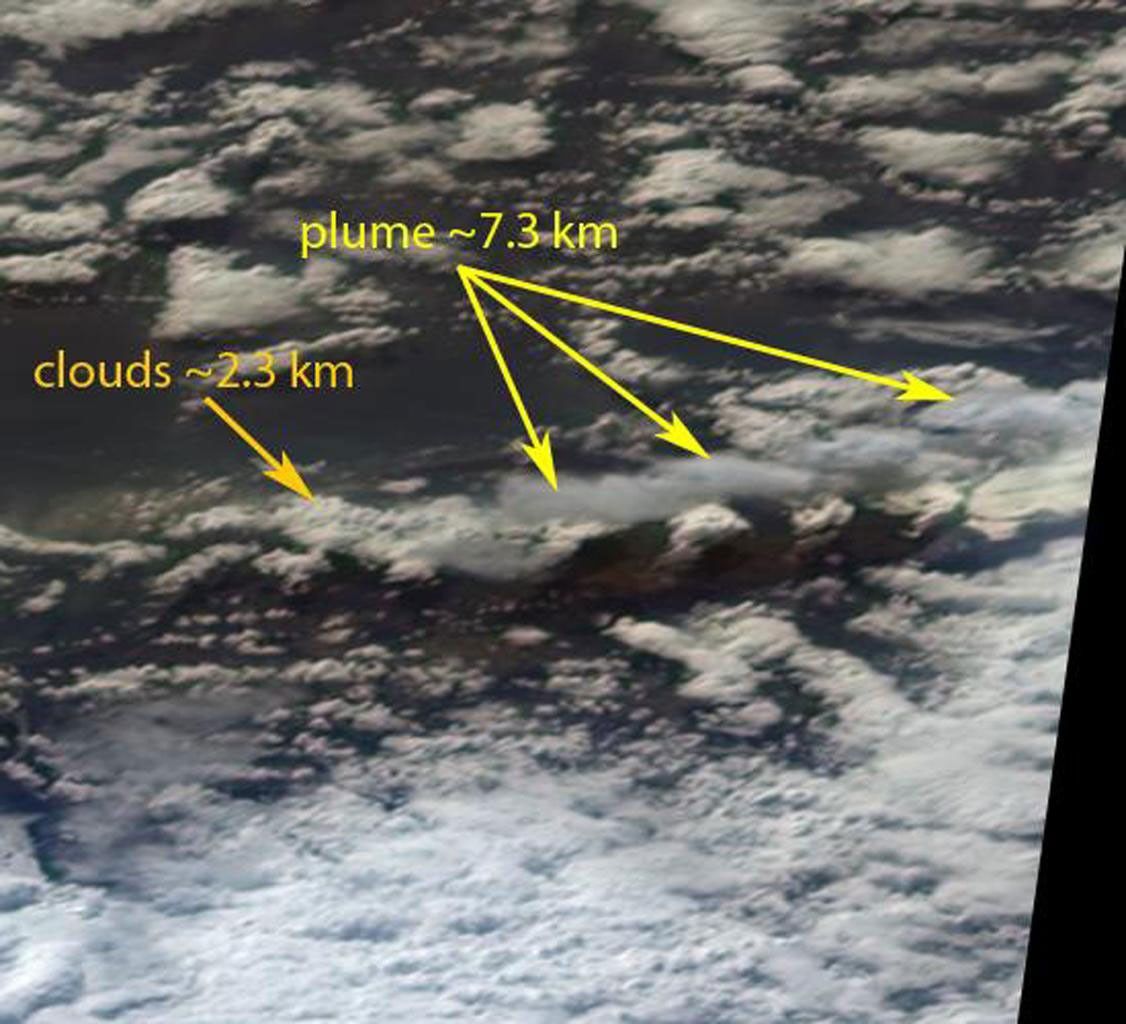 After a brief pause in eruptions that occurred in late March 2010, the Eyjafjallajökull Volcano in Iceland began erupting again on April 14, 2010. The resulting ash plume rose to high altitudes and was subsequently carried across the North Atlantic, causing closure of the airspace over northern Europe, grounding thousands of flights and stranding travelers around the world. The particles contained in volcanic ash clouds can cause significant damage to jet engines and the outside of aircraft. This image is a perspective view acquired April 14, 2010 by the 70-degree forward-viewing camera from the Multi-angle Imaging SpectroRadiometer (MISR) instrument aboard NASA's Terra spacecraft, looking southward at the plume. East is at the left. The image is approximately 76 kilometers (47 miles) wide, and is centered approximately 60 kilometers (37 miles) east of the volcano. Stereoscopic analysis of the data from this and another of MISR's cameras put the height of the plume at about 7.3 kilometers (4.5 miles), more than three times higher than the low clouds that are visible in much of the scene.