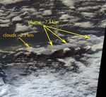 Ash from the recent eruptions was viewed again on April 15, 2010, to the north of the British Isles. Figure 1 is a view from MISR's nadir (vertical-viewing) camera, and shows the ash as a brownish-colored plume. This image measures 212 by 185 kilometers (132 by 115 miles) and its center is located between the Faeroe and Shetland Islands. Here, north is at the top and east is at the right. Figure 2 shows stereoscopic heights superimposed on the image, along with a color-coded scale. There are three main components of this scene: low clouds at altitudes below 2.5 kilometers (1.6 miles), the ash plume between 3 and 4.5 kilometers (1.9 and 2.8 miles), and cirrus clouds near 8 kilometers (5 miles). Interestingly, the retrieved heights of the ash plume in this image are lower than the range of 5.4 to 10 kilometers (3.4 to 6.2 miles) reported in the media.
