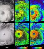 Along the left are radiance images from MISR's vertical-viewing (nadir) camera, at center are cloud-top height fields, and the right-hand panels provide retrieved local albedo values. The cloud-top heights are retrieved using automated stereoscopic processing of data from multiple MISR cameras, and are uncorrected at this stage for the effects of the exceptionally high winds associated with the hurricane's rotation. Albedo values are dependent upon the observed cloud radiances as a function of view angle and upon the cloud height field, and are well-represented here. Albedo is a function of the amount of sunlight reflected back to space divided by the amount of incident sunlight. Cloud height and albedo are among the principle variables governing the influences of clouds on climate. Areas where height and albedo could not be retrieved are shown in dark grey.