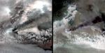 The right-hand image is a color-composite of data from three of the ASTER thermal infrared bands. The plume appears purple in color, indicating that it dominantly contains ash, and very little sulfur dioxide. The bright feature at the start of the plume is the incandescent lava flow produced by the eruption.
