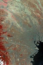 This false color infrared image covers an area 60 km wide and 75 km long in three bands of the short wavelength infrared region, with a spatial resolution of 15 m. It shows part of the Tokyo metropolitan area extending south to Yokohama; included are the Ginza District, Haneda airport and the Imperial Palace. To the west, Tokyo is hemmed in by mountains, covered with forests (displayed in red); on the southeast, Tokyo Bay is one of the world's great harbors.