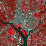 The White House, the Jefferson Memorial, and the Washington Monument with its shadow are all visible in this image of Washington, D.C. With its 15-meter spatial resolution, ASTER can see individual buildings. Taken on June 1, 2000, this image covers an area 14 kilometers (8.5 miles) wide and 13.7 kilometers (8.2 miles) long in three bands of the reflected visible and infrared wavelength region. The combination of visible and near infrared bands displays vegetation in red and water in dark grays. The Potomac River flows from the middle left to the bottom center. The large red area west of the river is Arlington National Cemetery.