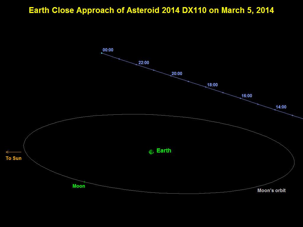 This graphic depicts the passage of asteroid 2014 DX110 past Earth on March 5, 2014. The asteroid's closest approach was at a distance equivalent to about nine-tenths of the distance between Earth and the moon. Times indicated on the graphic are Universal Time. A time near closest approach, 2200 Universal Time, is 2 p.m. PST.