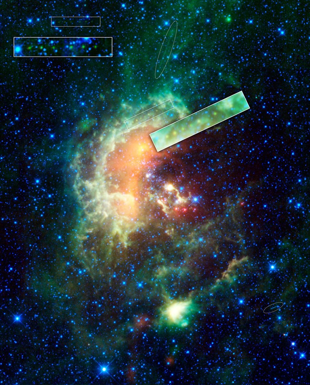A new infrared image from NASA's Wide-field Infrared Survey Explorer, or WISE, showcases the Tadpole nebula, a star-forming hub in the Auriga constellation about 12,000 light-years from Earth. As WISE scanned the sky, capturing this mosaic of stitched-together frames, it happened to catch an asteroid in our solar system passing by. The asteroid, called 1719 Jens, left tracks across the image, seen as a line of yellow-green dots in the boxes near center (Figure 1). A second asteroid was also observed cruising by, as highlighted in the boxes near the upper left (the larger boxes are blown-up versions of the smaller ones).