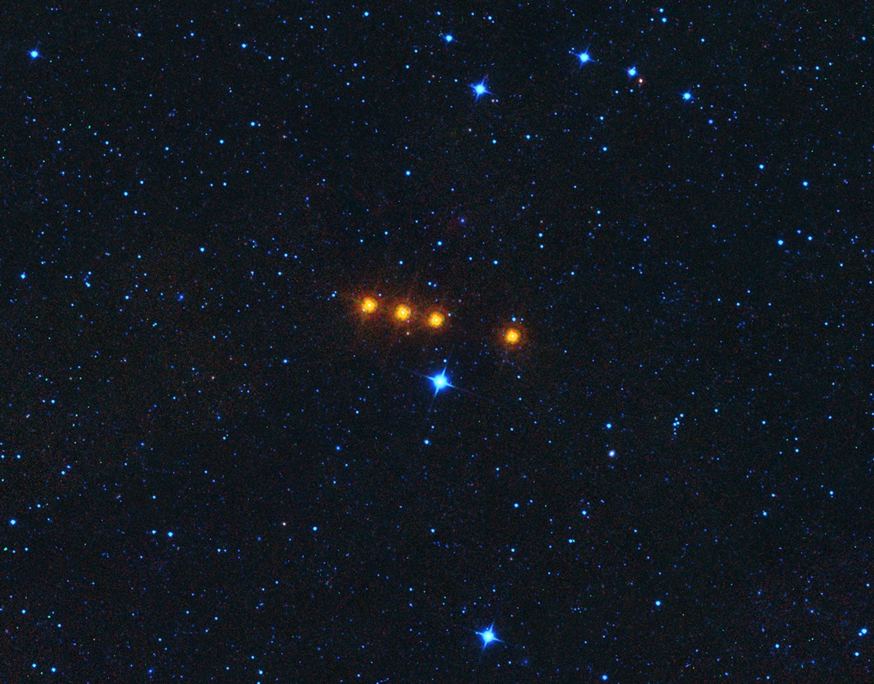 The moving asteroid appears as a string of red dots because it is much cooler than the distant background stars. Stars have temperatures in the thousands of degrees, but the asteroid is cooler than room temperature. Thus the stars are represented by shorter wavelength (hotter) blue colors in this view, while the asteroid is shown in longer wavelength (cooler) reddish colors.