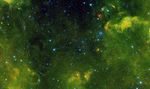 Clouds of gas and dust surround the region, visible only in infrared light.