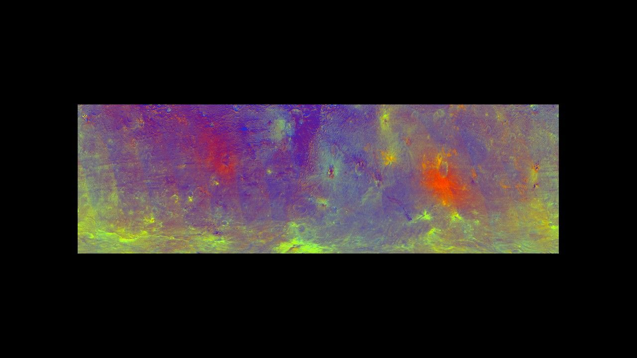 Scientists assigned different colors for the ratios of two wavelengths of radiation detected by the framing camera to indicate areas that are relatively redder or bluer. The red indicates wavelengths at 750 nanometers divided by 440 nanometers. Blue indicates areas at 440 nanometers divided by 750 nanometers. Scientists are still studying why certain areas look redder or bluer. Green indicates areas at 750 nanometers divided by 920 nanometers, suggesting the presence of the iron-rich mineral pyroxene or large-sized particles.