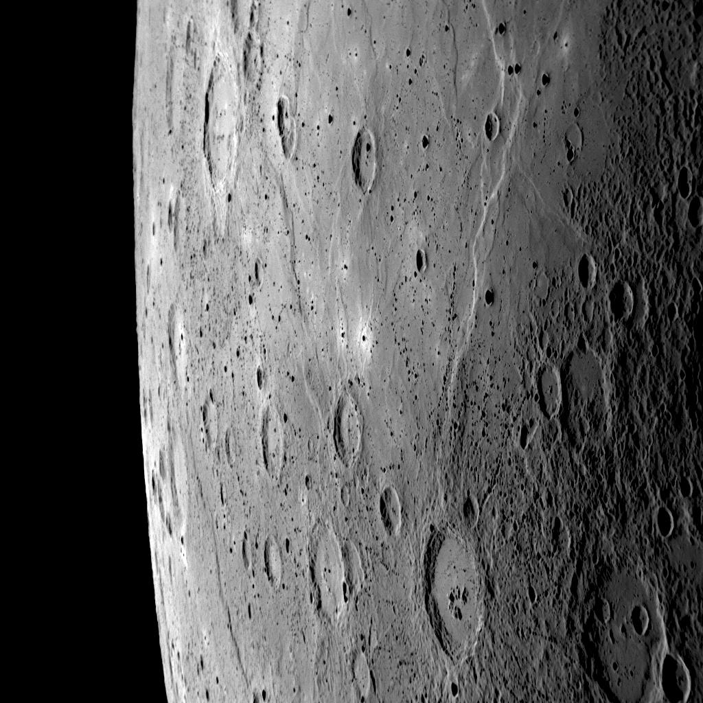 Taken as MESSENGER approached Mercury, this NAC image shows a portion of the sunlit crescent-shaped planet (see PIA11247) with the edge of Mercury against the blackness of space. A large region of smooth plains can be seen in the upper portion of this image, extending to the north, into an image previously released on October 8 (see PIA11353). To the south, near the edge of the planet, a lengthy cliff face is visible running off the bottom of the image and onto an image released on October 17 (see PIA11370). With this overlap, these three NAC images can be nicely mosaicked together and are part of a larger 44-image mosaic set. Particularly prominent in the image here is a crater near the bottom of the frame with numerous associated chains of small secondary craters. The secondary craters, which are especially visible on the southern portion of the smooth plains, were formed when material was thrown out onto the surrounding surface during the impact event that created the large crater. Thus, this large crater was formed after the creation of the neighboring smooth plains.