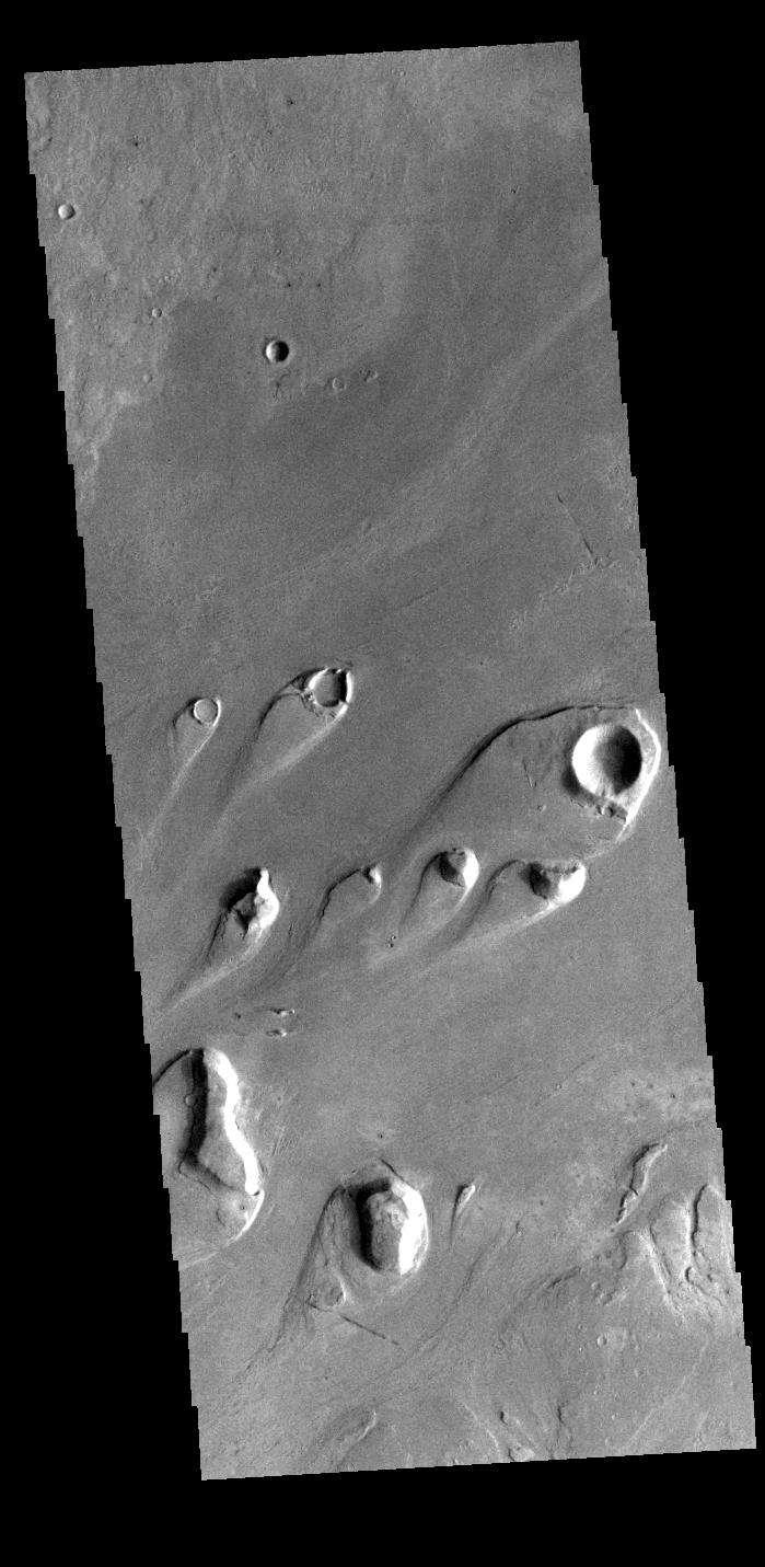 Today's VIS image shows part of Athabasca Valles. Multiple streamlined islands are seen in this image. The teardrop shaped features were formed by liquid flow deflected around features such as craters and hills. The 'tail' of the island points downstream. The source of the fluid was likely an outburst of groundwater, perhaps related to the Elysium volcanic complex located to the northwest of this image.