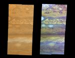 True-color (left) and false-color (right) mosaics of Jupiter's northern hemisphere between 10 and 50 degrees latitude. Jupiter's atmospheric motions are controlled by alternating eastward and westward bands of air between Jupiter's equator and polar regions. The direction and speed of these bands influences the color and texture of the clouds seen in this mosaic. The high and thin clouds are represented by light blue, deep clouds are reddish, and high and thick clouds are white. A high haze overlying a clear, deep atmosphere is represented by dark purple. This image was taken by NASA's Galileo spacecraft on April 3, 1997 at a distance of 1.4 million kilometers (.86 million miles).