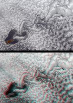 The lower view is a stereo picture generated from data acquired by MISR's fore- and aft-viewing 70-degree cameras. A 3-D effect is obtained by viewing the image with red/blue glasses and placing the red filter over your left eye. Note how the downwelling atmospheric motion (change in elevation from high to low) is accompanied by a clearing in the center of the first vortex. As the vortices propagate downstream, their rotational velocities weaken. As a consequence, the induced vertical motion and cloud-clearing effect weakens as well.