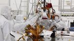 In this image, engineers at NASA's Jet Propulsion Laboratory are dressed head to toe in "bunny suits" (white hoods, lab-style coats and gloves). Only their eyes and foreheads can be seen. They are huddled around the base of the rover Curiosity's "neck" (its Mast). They watch intently as they carefully lower the Mast to attach it to the rover's flat "back."A cluster of yellow and red wires on the rover's body pokes up in the foreground of the image.