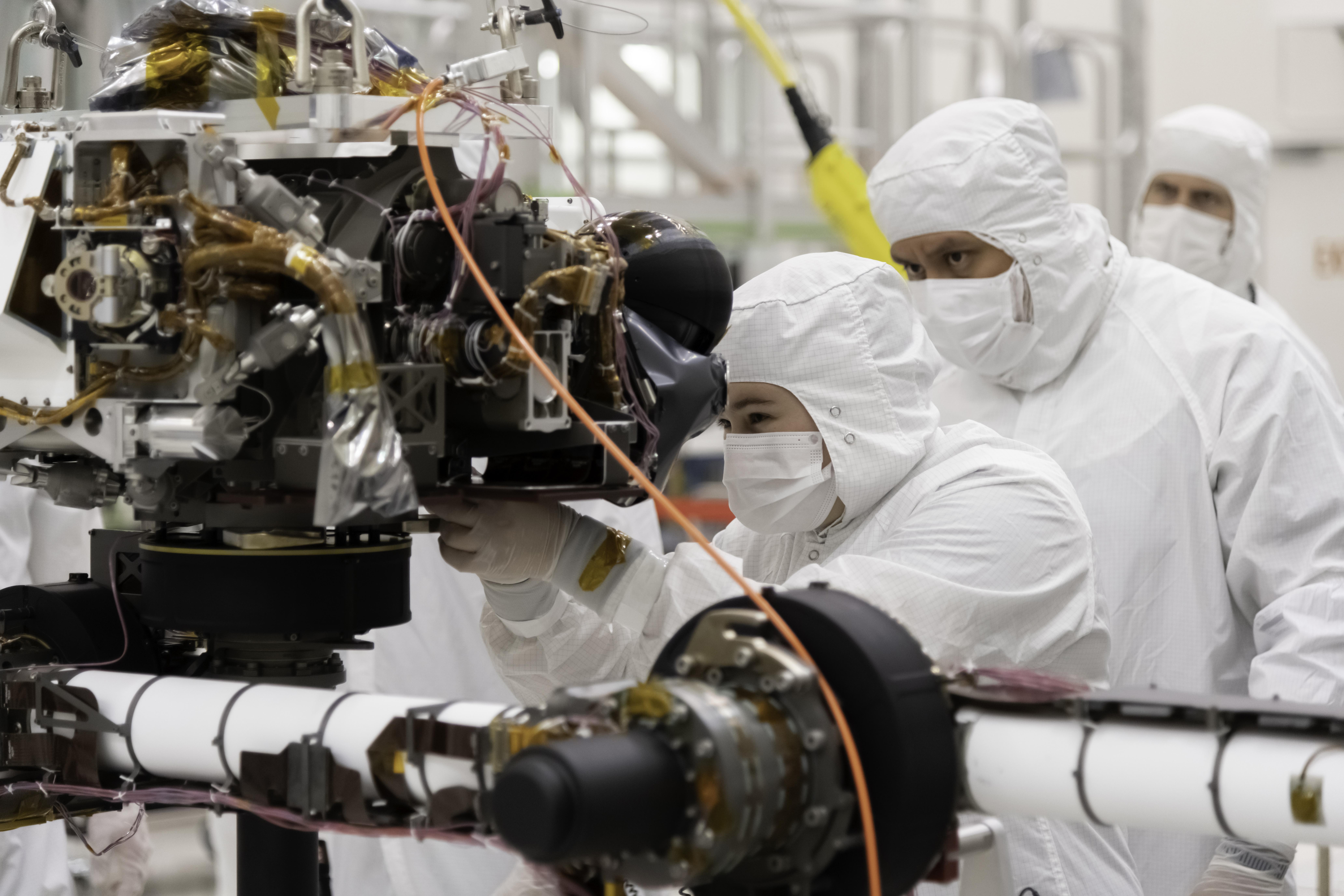 In this image taken on July 11, 2019, engineers at JPL install a sensor-filled turret on the end of the rover's 7-foot-long (2.1-meter-long) robotic arm. The turret includes HD cameras, the Scanning Habitable Environments with Raman & Luminescence for Organics & Chemicals (SHERLOC) science instrument, the Planetary Instrument for X-ray Lithochemistry (PIXL) science instrument, and a percussive drill and coring mechanism.