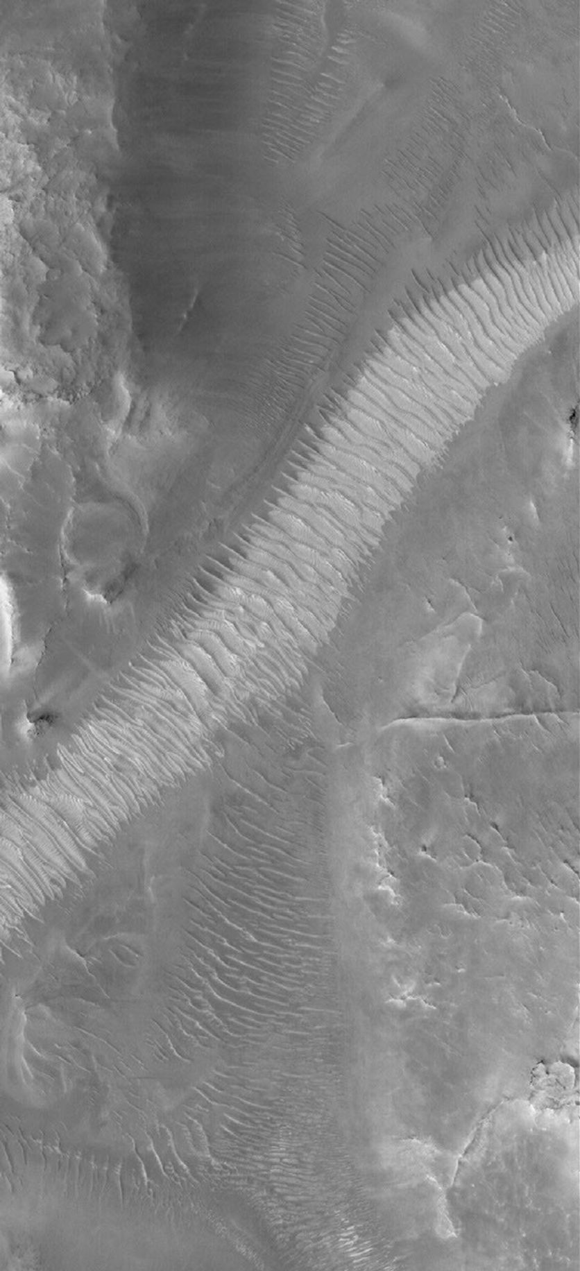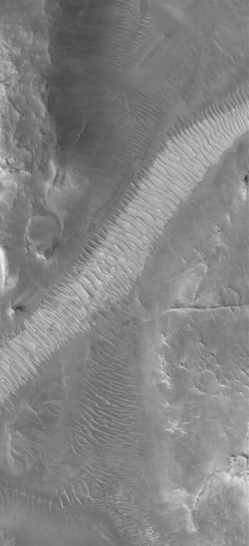 This Mars Global Surveyor (MGS) Mars Orbiter Camera (MOC) image shows windblown ripples on the floor of Auqakuh Vallis. The light-toned area, running diagonally across the scene from the lower left (southwest) to the upper right (northeast), may be dust that has accumulated in the bottom of the valley and on top of the ripples.