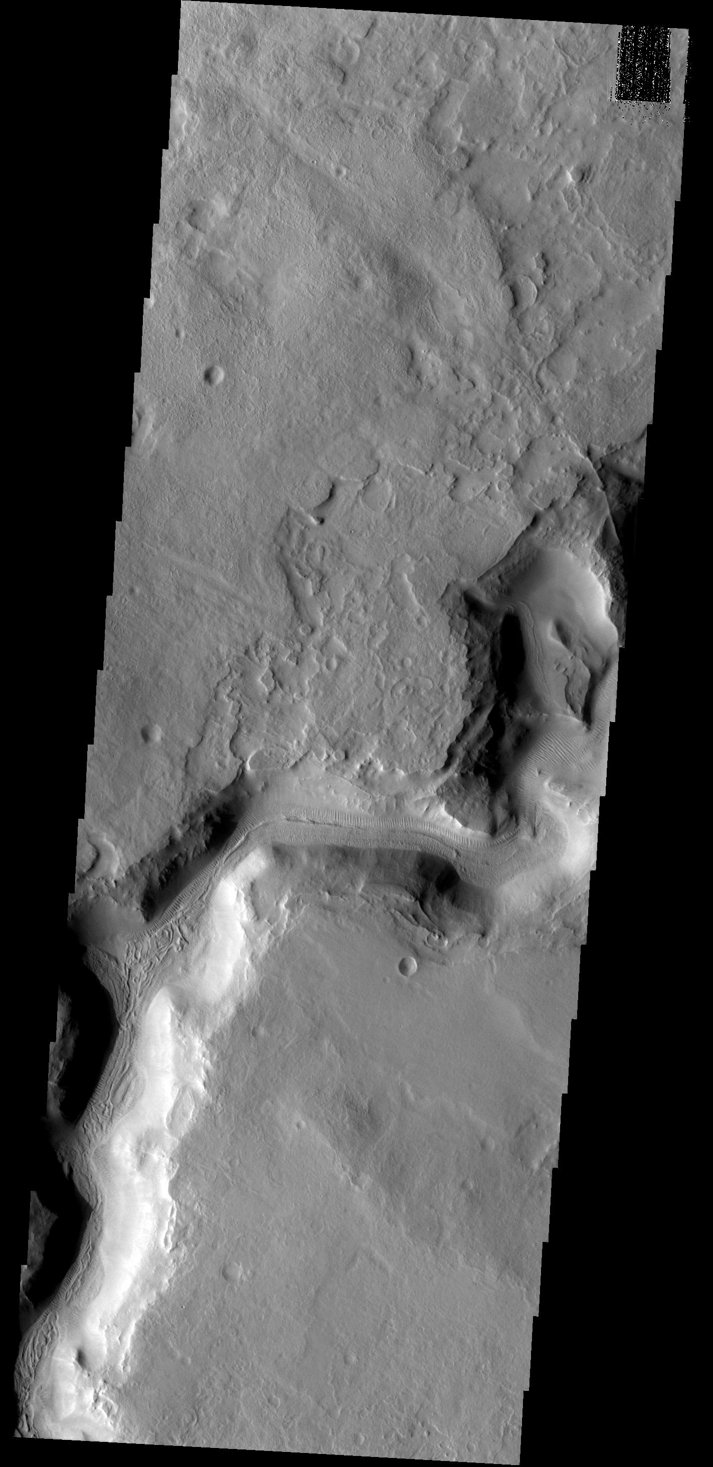 Note: this THEMIS visual image has not been radiometrically nor geometrically calibrated for this preliminary release. An empirical correction has been performed to remove instrumental effects. A linear shift has been applied in the cross-track and down-track direction to approximate spacecraft and planetary motion. Fully calibrated and geometrically projected images will be released through the Planetary Data System in accordance with Project policies at a later time.