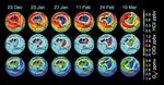 These data maps from Aura's Microwave Limb Sounder depict levels of hydrogen chloride (top), chlorine monoxide (center), and ozone (bottom) at an altitude of approximately 19 kilometers (490,000 feet) on selected days during the 2004-05 Arctic winter. White contours demark the boundary of the winter polar vortex.