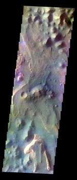 The THEMIS VIS camera contains 5 filters. The data from different filters can be combined in multiple ways to create a false color image. These false color images may reveal subtle variations of the surface not easily identified in a single band image. Today's false color image shows part of Aureum Chaos.