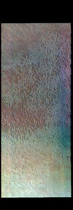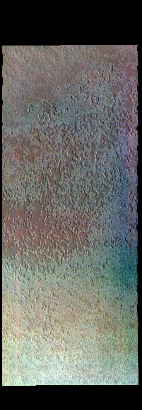 The THEMIS VIS camera contains 5 filters. The data from different filters can be combined in multiple ways to create a false color image. These false color images may reveal subtle variations of the surface not easily identified in a single band image. Today's false color image shows part of Australe Mensa, part of the south polar ice cap. The round depressions have given rise to the informal name Swiss cheese. The depressions are seen only in the top layer of the ice.