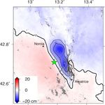In this map, the colors of the surface displacements are proportional to the surface motion. The red and pink tones show the areas where the land moved toward the satellite by up to 2 inches (5 centimeters). The area with various shades of blue moved away from the satellite, mostly downward, by as much as 8 inches (20 centimeters). Contours on the surface motion are 2 inches (5 centimeters) The green star shows the epicenter where the earthquake started as located by the U.S. Geological Survey National Earthquake Information Center. Black dots show town locations.