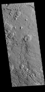 The arcuate fractures and broken up surface shown in this image is called Avernus Colles. This unique surface has developed on the southeast margin of Elysium Plainitia.