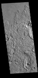 Called Avernus Colles, these broken blocks and arcuate fractures mark the transition region between the southern highlands and the northern lowlands of Mars north of Apollinaris Mons, on the margin with Elysium Planitia.
