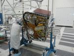 Engineers check cables on back of Aquarius instrument in the clean room at NASA's Jet Propulsion Laboratory in Pasadena, Calif.
