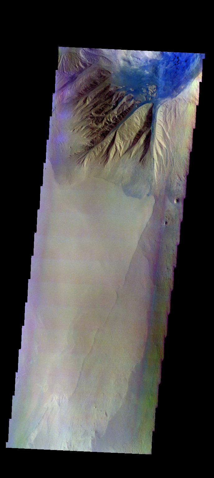 The THEMIS camera contains 5 filters. The data from different filters can be combined in multiple ways to create a false color image. These false color images may reveal subtle variations of the surface not easily identified in a single band image. Today's false color image shows the northern tip of Baetis Mensa. In false color images dark blue is often basaltic sands. In this image it is possible to trace the sands from the erosion of Beatis Mensa moving down the canyon gullies to the floor of Ophir Chasma.