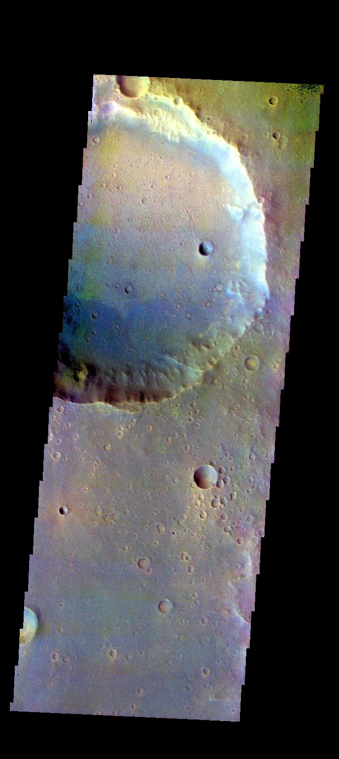 The THEMIS camera contains 5 filters. The data from different filters can be combined in multiple ways to create a false color image. These false color images may reveal subtle variations of the surface not easily identified in a single band image. Today's false color image shows part of Bamba Crater located in Xanthe Terra.