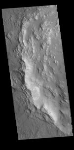 Today's VIS image shows the western rim of Bamberg Crater. The complex nature of the rim is one indication of the relative youth of this crater in relation to it's surrounding. Many gullies dissect this rim.