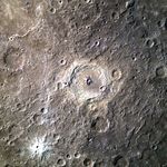 Bartok, a large complex crater in Mercury's southern hemisphere, is located in the center of the frame. In this colored image, Bartok's central peak appears to be blue and is darker than the surrounding surface. This suggests that the central uplift is composed of material that has different properties than the surrounding terrain, providing clues to the geologic history of the region. To the southwest of Bartok, a young crater with stunning rays is also visible.